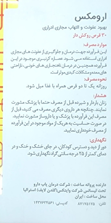 نحوه مصرف ارومکس: روزانه 1 عدد قرص همراه با غذا