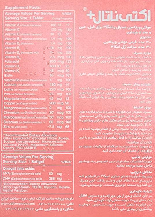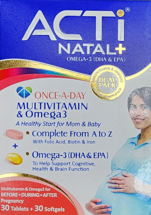 اکتی ناتال پلاس، حاوی ۳۰ عدد قرص مولتی ویتامین و ۳۰ عدد سافت ژل امگا ۳ برای تأمین نیازهای تغذیهای مادران در دوران بارداری و شیردهی