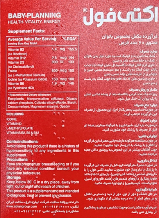 اکتی فول، مکمل حاوی B2 ،B6 ،B9 ،B12، ویتامین D3 و ید